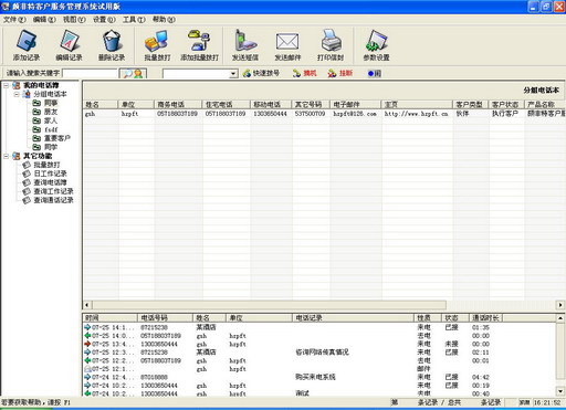 批量电话拨打:对于待拨打的电话,可以加入到批量拨打队列中,由电脑自动拨打,未接通的电话还可以定时提醒。此功能可以用来对某一类的用户联系,如:查询出来所有潜在客户,然后电话拜访。
